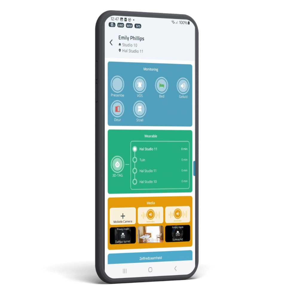 Zorgprofessionals ontvangen alleen data die belangrijk is voor hun dienst. Ze zien waar de cliënt is. In bed of eruit. Op de kamer, het toilet of dwalend in de gang. Ook zien ze waar hun collega’s nú zijn. Via de app kunnen ze communiceren met collega’s en cliënten, telefonisch of via beeldbellen. Dankzij het intuïtieve design houden zorgprofessionals probleemloos het overzicht.